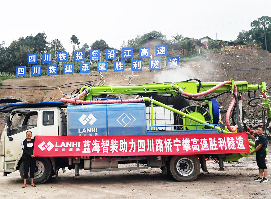 LCHP40D車載濕噴機(jī)械手采用汽車底盤,是一款綜合國內(nèi)隧道初支混凝土噴錨工藝及施工情況研發(fā)升 級的一款專用設(shè)備。該設(shè)備具有噴射方量大(最大噴射方量40m3/h)、不易堵管、回彈低、機(jī)動(dòng)性好、性能 穩(wěn)定可靠等特點(diǎn)。解決了傳統(tǒng)小型濕噴機(jī)不能滿足大、長隧道混凝土噴射的不足,提高了施工效率,減少了 混凝土消耗量,切實(shí)保障施工質(zhì)量。